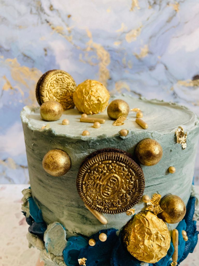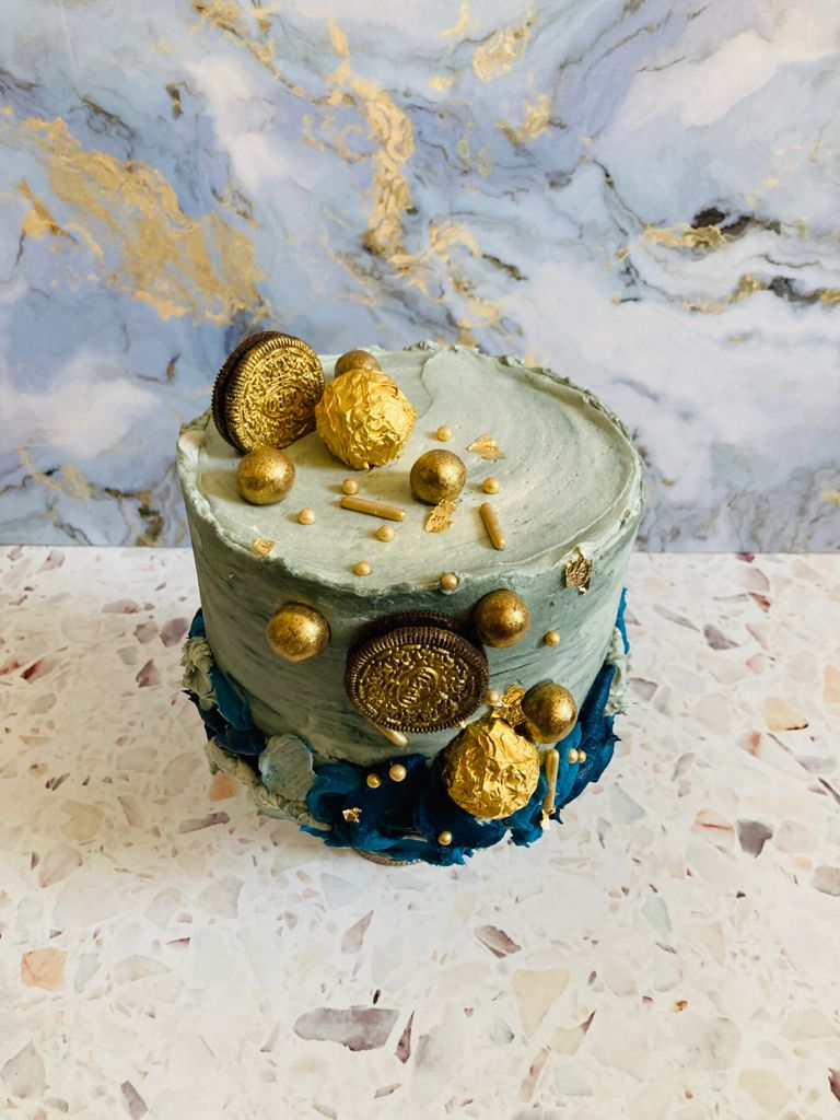 Beautiful grey marbled effect with shades of blue butter cream and decorated with gold accents.